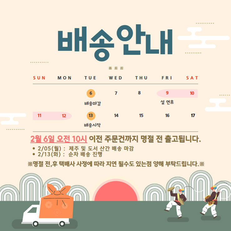 2월 6일 오전 10시 이전 주문 건 까지 명절 전 출고 됩니다.