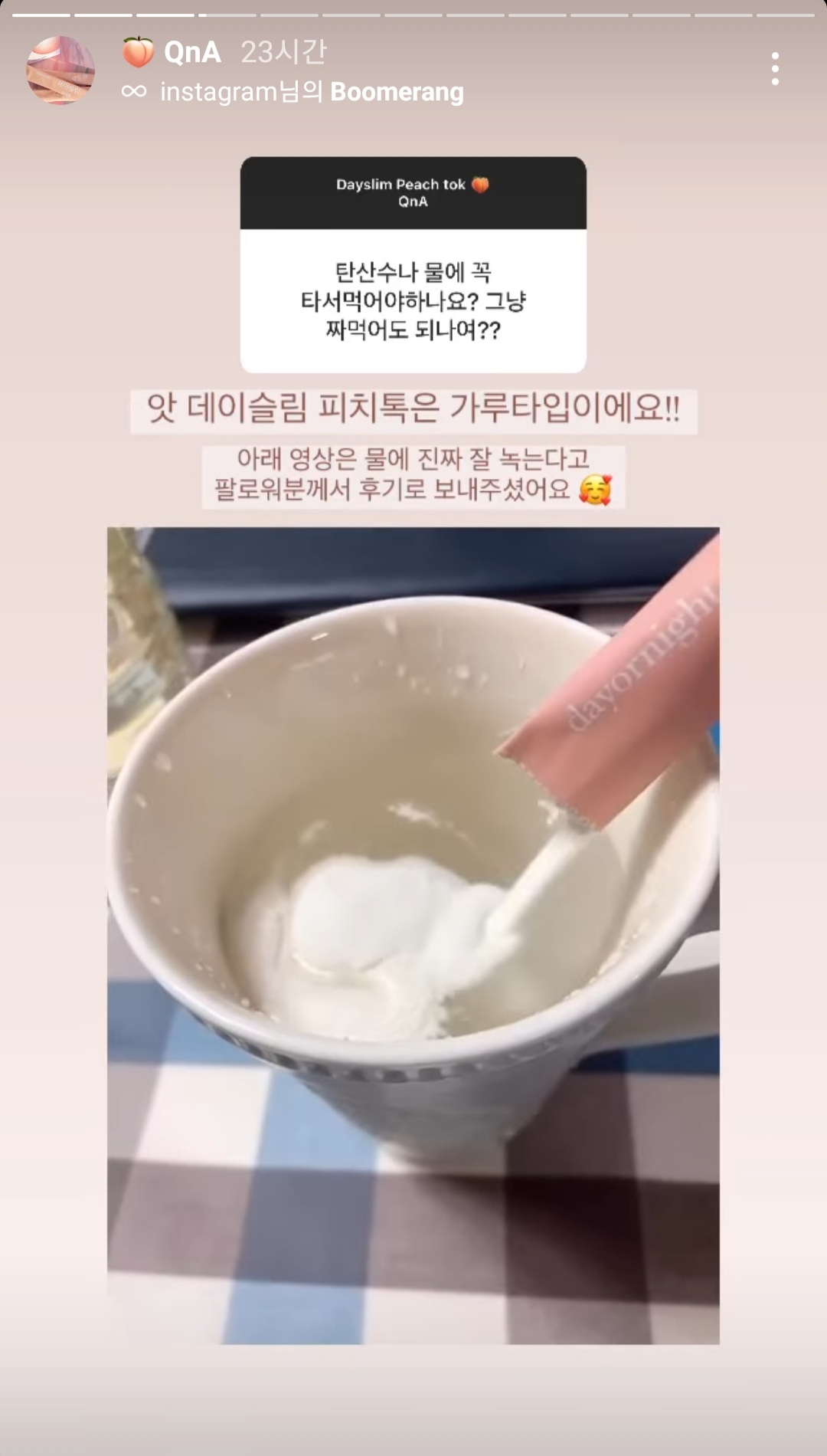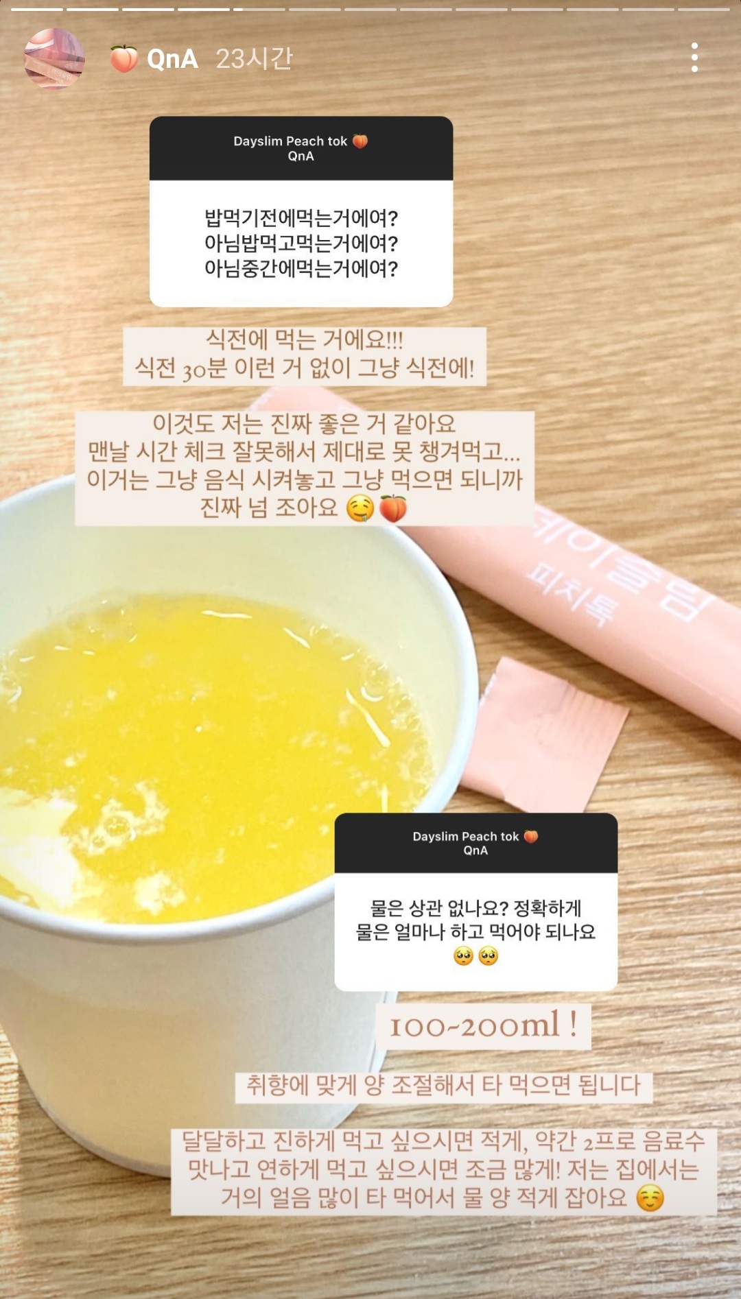 데이슬림 피치톡 봉지나 빨대, 젓가락같은걸로 한 3번 저어주면 3초컷으로 녹으니까