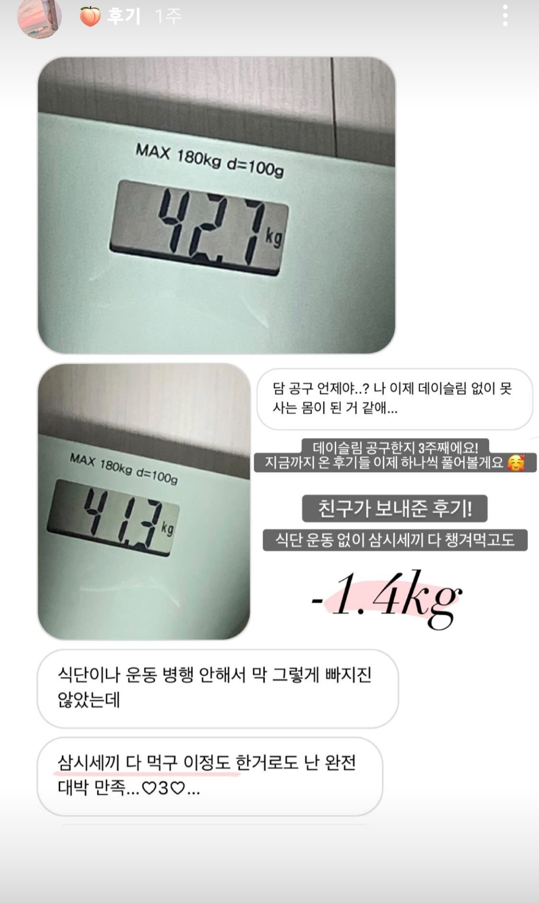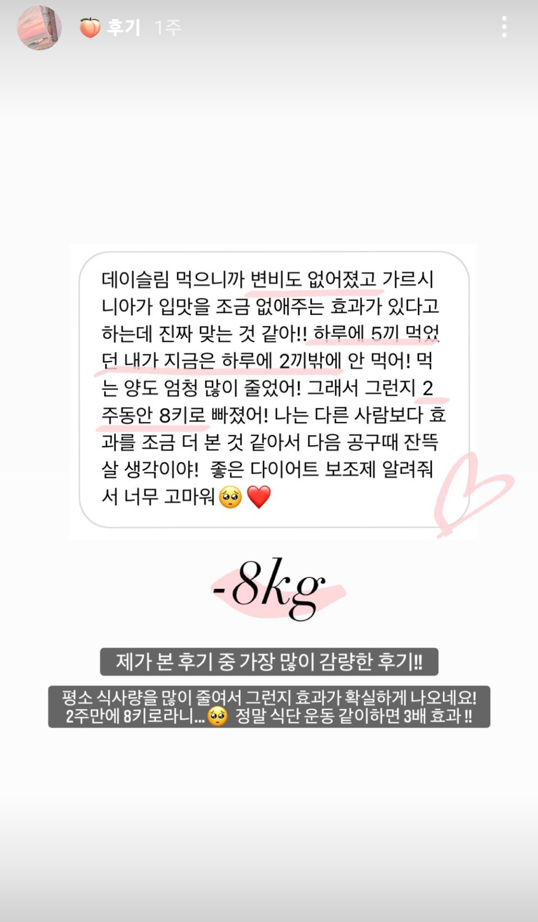 운동+식단만 했을 때 1kg가 빠질거를 데이슬림과 병행하면 3kg가 빠지게 해주는