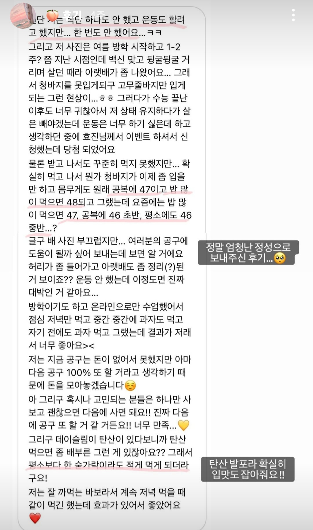 운동이랑 식단을 병행하시면 저보다 더 큰 효과를 보실 수 있을거에요!