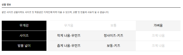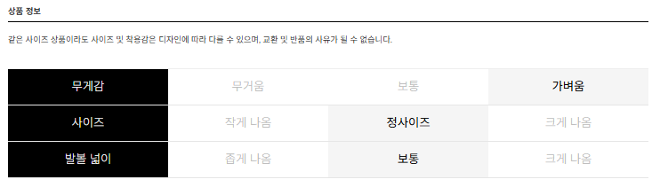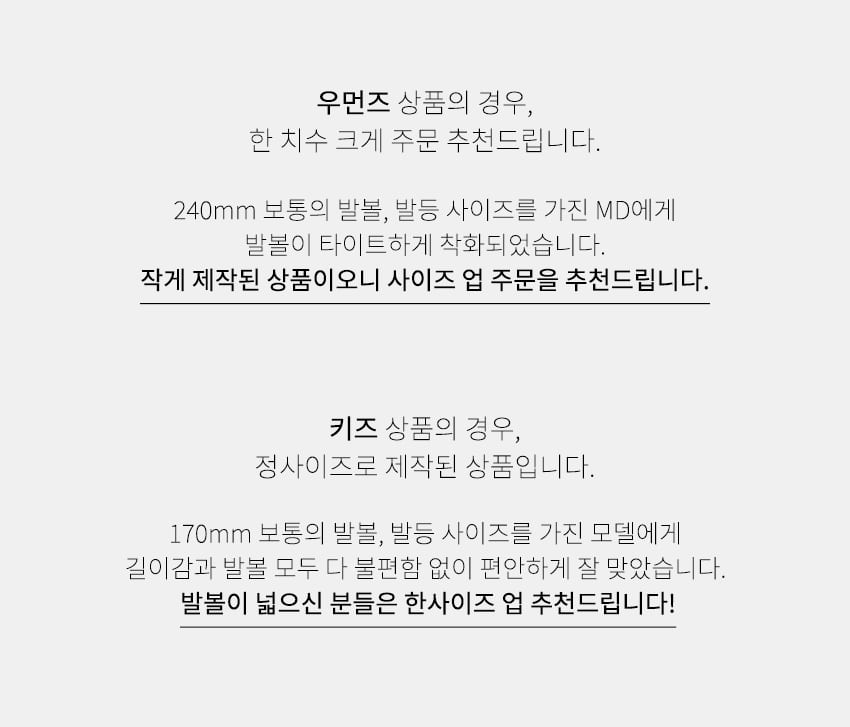 같은 사이즈 상품이라도 사이즈 및 착용감은 디자인에 따라 다를 수 있으며, 교환 및 반품의 사유가 될 수 없습니다.