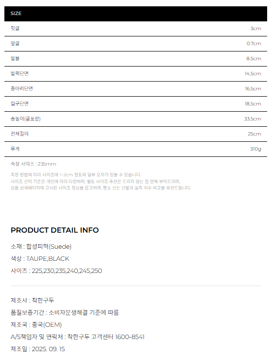 뒷굽 1.5cm / 앞굽 0.7cm / 앞코 14.5cm