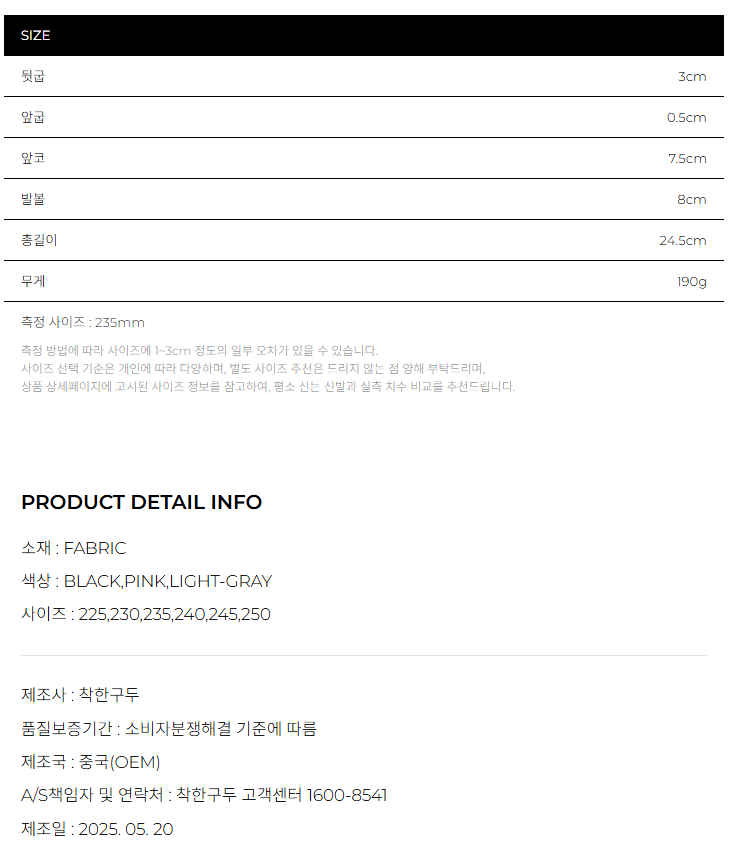 뒷굽 3cm / 앞굽 0.7cm / 발볼 8.5cm