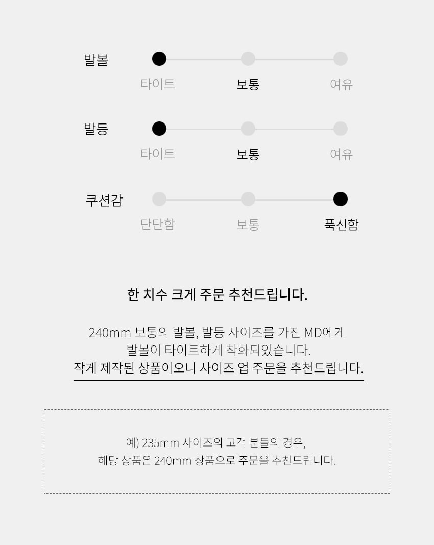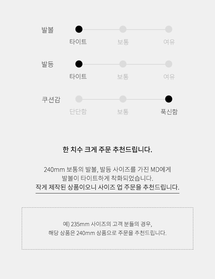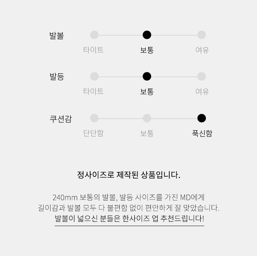 상품 상세페이지에 고시된 사이즈 정보를 참고하여, 평소 신는 신발과 실측 치수 비교를 추천드립니다.