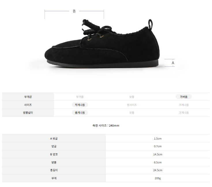 발볼 8.5cm / 총길이 24.5cm / 무게 209g