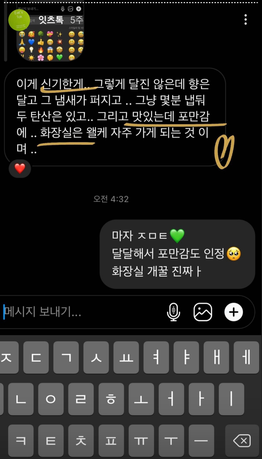 잇츠톡 드시자마자 바로 신호와서 화장실 가신다고ㄷㄷ